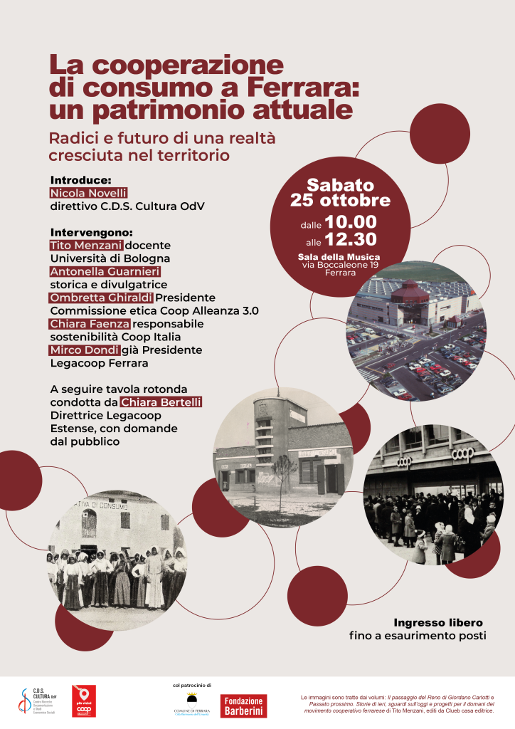 L’associazione C.D.S. Centro Ricerche Documentazione e Studi Economico Sociali OdV organizza sabato 25 ottobre, dalle 10.00 alle 12.30, presso la Sala della Musica del Chiostro S. Paolo in via Boccaleone 19 a Ferrara, l’incontro La Cooperazione di consumo a Ferrara: un patrimonio attuale. Radici e futuro di una realtà cresciuta nel territorio.