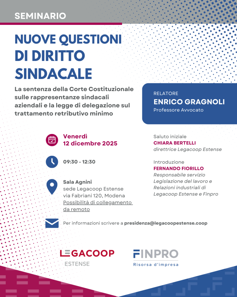 L’ufficio legislazione del lavoro di Legacoop Estense e Finpro organizza, il 12 dicembre, un seminario online e in presenza dal titolo “Nuove questioni di diritto sindacale”, nel corso del quale interverrà l’Avvocato Enrico Gragnoli.
