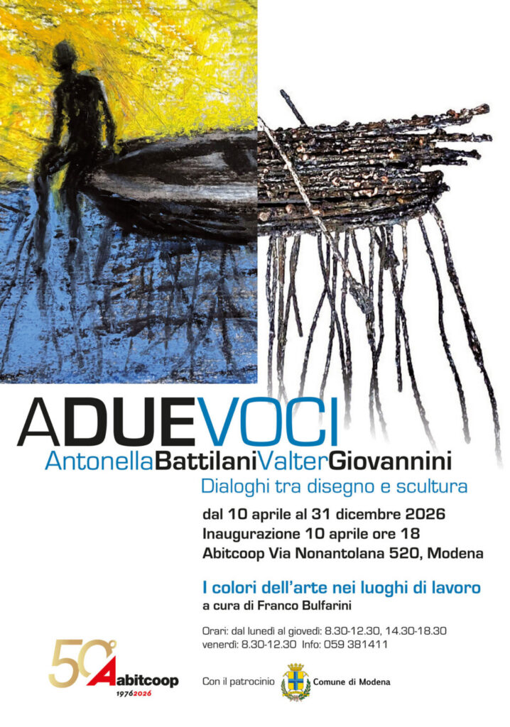 Il progetto nasce infatti con l’obiettivo di portare l’arte negli spazi quotidiani, creando ambienti accoglienti, di relazione e bellezza condivisa, non solo per chi vi lavora quotidianamente ma anche per le persone – soci e socie della cooperativa, fornitori, cittadini – che accedono agli uffici. Gli artisti Antonella Battilani e Valter Giovannini si cimenteranno in un dialogo tra disegno e scultura capace di unire segno e materia in un percorso espositivo originale.