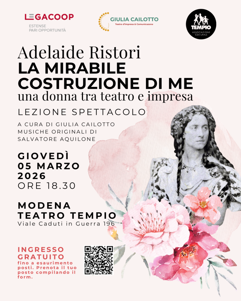 Questi i temi al centro dello spettacolo “Adelaide Ristori. La mirabile costruzione di me”, la lezione spettacolo di teatro d’impresa scritta e interpretata dall’attrice veronese Giulia Cailotto, con l’accompagnamento musicale di Salvatore Aquilone. L’evento, a ingresso gratuito, è promosso dalla Commissione Pari Opportunità di Legacoop Estense e si svolgerà giovedì 5 marzo alle ore 18:30 al Teatro Tempio di Modena (viale Caduti in Guerra 196).