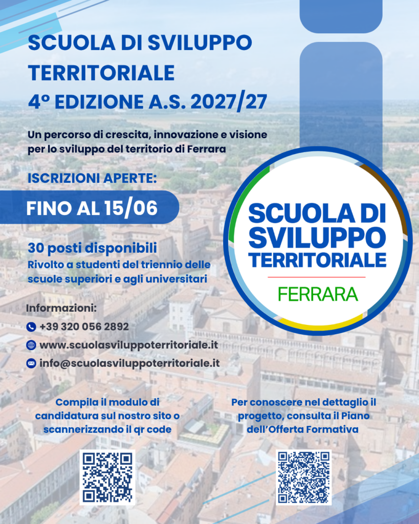 Sono aperte le iscrizioni alla IV edizione della Scuola di Sviluppo Territoriale di Ferrara per l’anno formativo 2026/27.