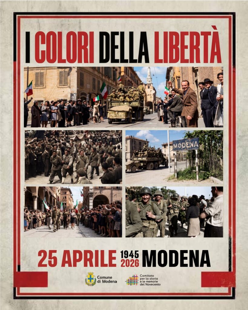 Costruito con un respiro ampio e articolato, capace di alternare momenti di riflessione storica, spettacolo, partecipazione attiva e ritualità civile, il calendario porta come titolo “I colori della libertà”. Per ravvivare la memoria, si è infatti pensato di ‘colorare’ le foto – provenienti dall’Istituto Storico – che ritraggono i momenti più emozionanti e carichi di pathos in cui Modena ha preso consapevolezza della sua rinnovata libertà. Questo colore, molto più che un fotoritocco, è il simbolo di quel percorso che l’Italia avrebbe compiuto negli anni a seguire, che la portò a dotarsi di una Costituzione ancora così attuale a 78 anni di distanza dalla sua promulgazione e a diventare uno dei paesi che ha fondato l’Unione Europea. Questo colore così vivido, affidato alla competente realizzazione del digital artist Michele Ronchetti, è quindi la traduzione cromatica della gioia che è esplosa nelle strade, di una spensieratezza che – seppur nelle costrizioni materiali – poteva finalmente tornare a far parte della vita, di una vita che finalmente tornava a essere libera e in pace.