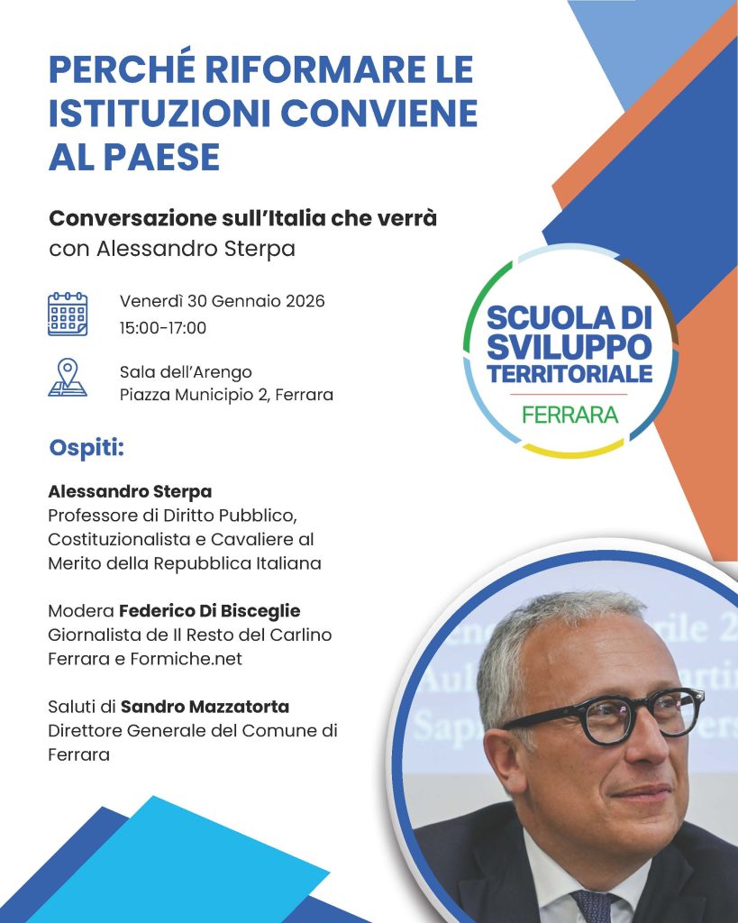 La Scuola di Sviluppo Territoriale di Ferrara prosegue il proprio ciclo di lezioni aperte alla cittadinanza. Il prossimo incontro, dal titolo “Perché riformare le istituzioni conviene al Paese. Conversazione sull’Italia che verrà”, è in programma venerdì 30 gennaio, dalle ore 15.00 alle 17.00, presso la Sala dell’Arengo del Comune di Ferrara